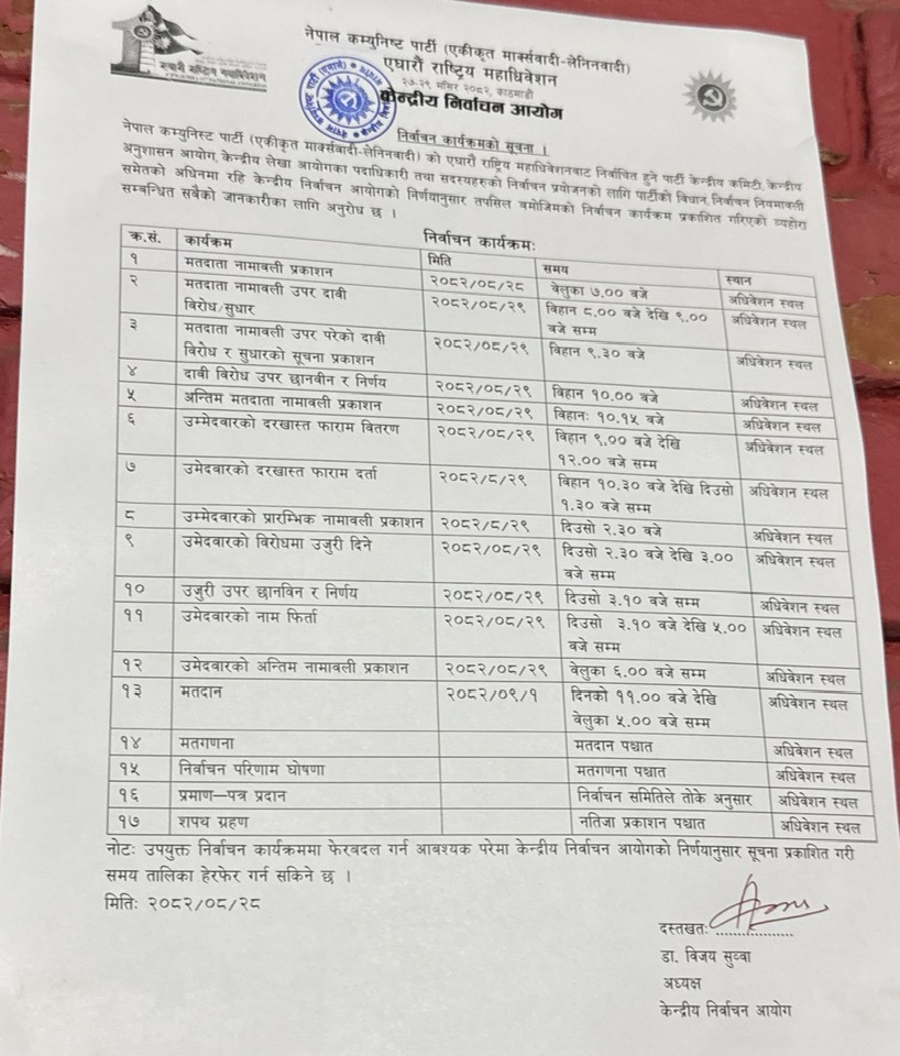 पार्टीको नयाँ नेतृत्व चयन प्रक्रिया पुस १ गतेसम्म सम्पन्न गर्ने गरी निर्वाचन कार्यतालिका तय गरिएको हो ।