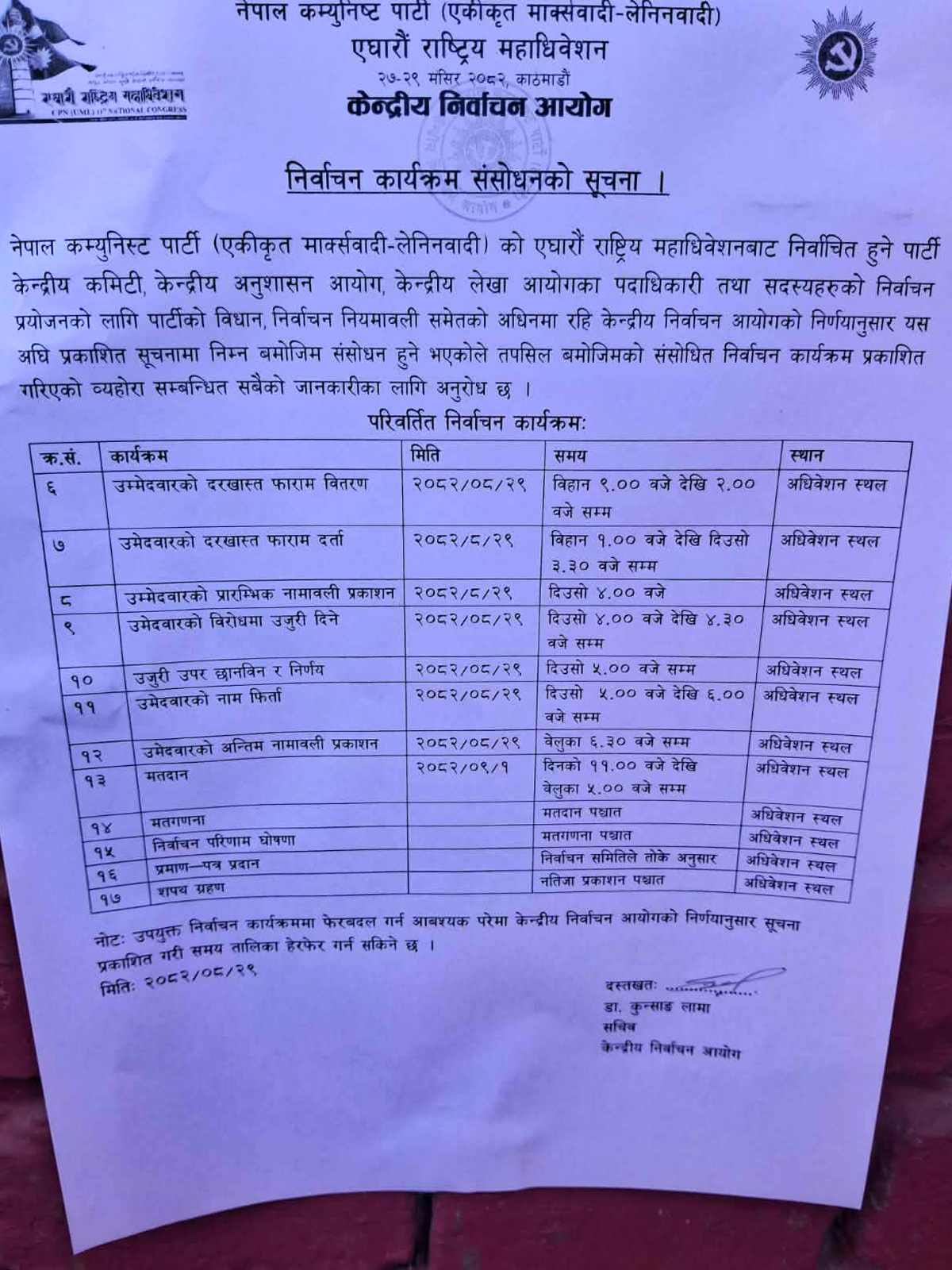 काठमाडौं । नेकपा एमालेको ११औँ महाधिवेशनबाट नयाँ नेतृत्व चयनका लागि तय गरिएको निर्वाचन कार्यतालिका संशोधन गरिएको छ।