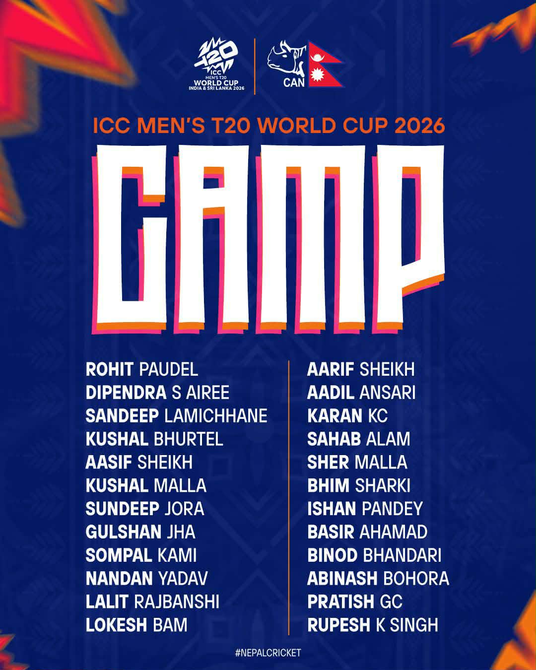 काठमाडौं। आईसीसी पुरुष टी२० विश्वकप २०२६ का लागि नेपाल क्रिकेट संघ (क्यान)ले प्रारम्भिक टोलीको घोषणा गरेको छ।
