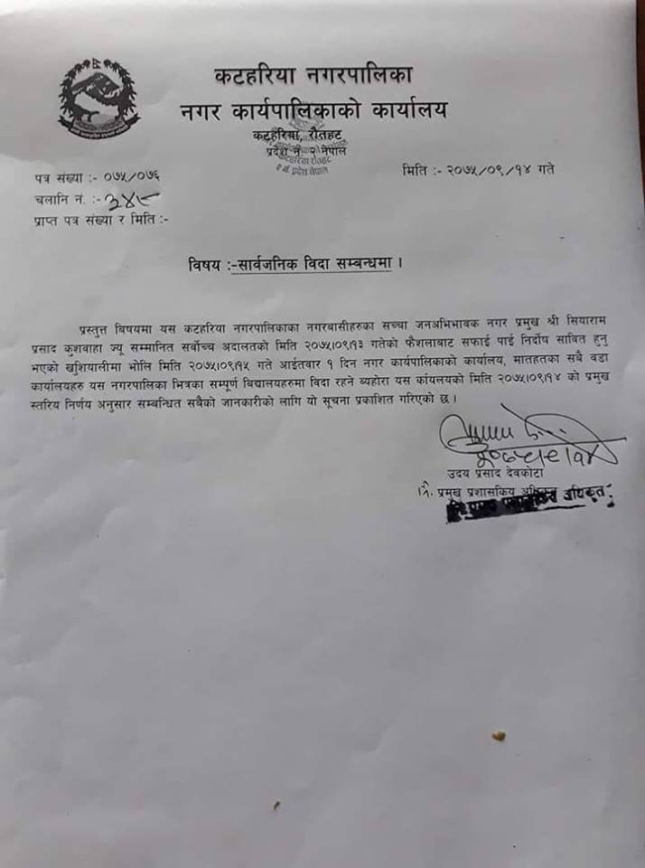 नेकपाका नेता सियाराम कुशवाहकाे तमासा, कटहरीया नगरपालिकामा अाइतबार सार्वजनिक विदा