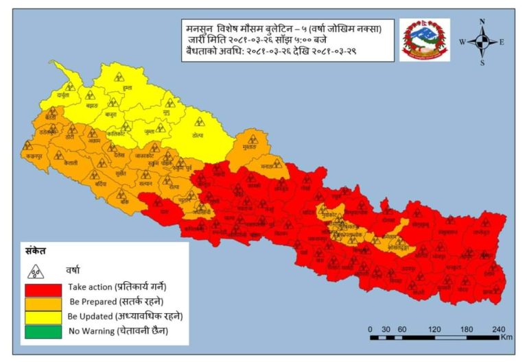 काठमाडौं । मनसुन रेखा नेपालतिर सरेकाले आगामी केही दिन नेपालका धेरै ठाउँमा भारी वर्षाको सम्भावना रहेको छ । जल तथा मौसम विज्ञान विभागको मौसम पूर्वानुमान महाशाखाले आगामी तीन दिन भारीदेखि अति भारीसम्म वर्षा हुने चेतावनी जारी गर्दै उच्च सतर्कता अपनाउन अनुरोध गरेको छ । मनसुन न्यूनचापीय प्रणाली सरदर स्थानबाट नेपालतर्फ