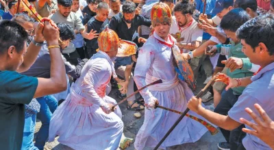 भादगाउँ । बडादसैँको ११ औँ दिन पापाङ्कुशा एकादशीको अवसरमा शुक्रबार मध्यपुर थिमिमा मल्लकालीन युद्धको झल्को दिने गरी ‘खाँ पिहाँवईगु’ (खाँ