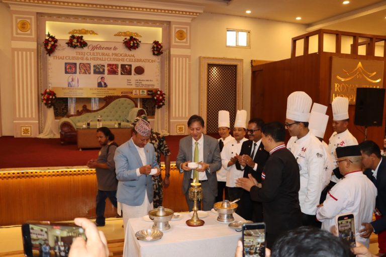 काठमाडौँ । नेपाली गुन्द्रुकको सुप र थाई सुप तोमयाम एउटै मेनुमार्फत प्रस्तुत गरिएको छ । भक्तपुरको रोयल थाईमा बुधबार सम्पन्न भोजनलिपि स्वादको छैटौँ संस्करणमा ऊर्जामन्त्री दीपक खड्का र नेपालका लागि थाइल्यान्डका राजदूत सुवापोङ सिरिसोर्नले संयुक्त रूपमा स्वाद लिएर दुवै परिकारको प्रवर्द्धन अभियान सुरु गर्नुभएको हो । नेपाली खाना प्रवर्द्धन अभियानको