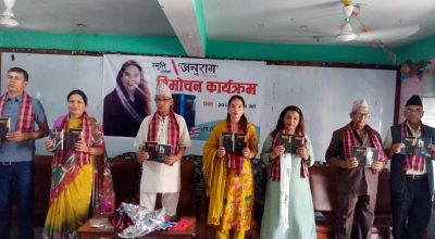 दाङ। साहित्यकार स्मृति योगीको ‘अनुराग’ गजलसङ्ग्रहको आज घोराहीमा एक कार्यक्रमबीच विमोचन गरिएको छ । राप्ती साहित्य परिषद् जिल्ला शाखा दाङको आयोजनामा