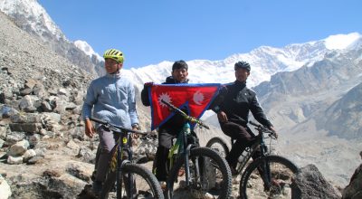 कञ्चनजङ्घाको हिमाललाई नजिकबाट नियाल्दै, हरेक पाइलामा चिसो हावासँग जुध्दै, उकालो बाटोमा साइकल धकेल्दै र कहिले उफार्दै अघि बढ्ने ती चार
