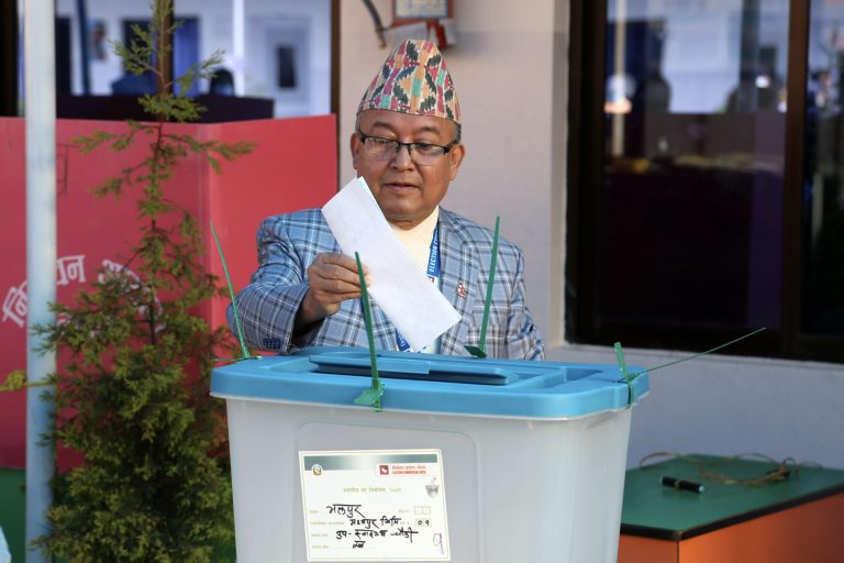 काठमाडौं । प्रमुख निर्वाचन आयुक्त दिनेशकुमार थपलियाले स्थानीय तह निर्वाचनको उम्मेदवारलाई मतदान गर्नुभएको छ । प्रमुख निर्वाचन आयुक्त थपलियाले भक्तपुरको मध्यपुर थिमि नगरपालिका –१ स्थित उपस्वास्थ्य चौकीमा रहेको मतदान केन्द्रबाट मतदान गर्नुभएको छ । तस्बिरः नवीन पौडेल-रासस