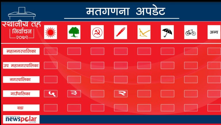 स्थानीय तह निर्वाचनको मतपरिणाम सार्वजनिक हुने क्रम जारी छ । हाल सम्म ८ वटा पालिकाको नतिजा सार्वजनिक भएको छ ।
