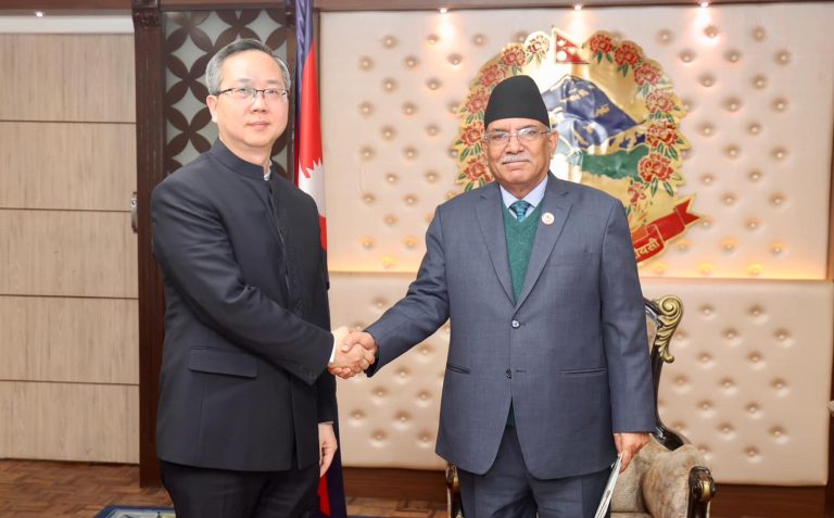 काठमाडौँ । नेपालका लागि चीनका नयाँ राजदूत छन सोङले प्रधानमन्त्री पुष्पकमल दाहाल ‘प्रचण्ड’ सँग भेटवार्ता गर्नुभएको छ । सोमबार बिहान प्रधानमन्त्रीको सरकारी निवास बालुवाटारमा राजदूत सोङले प्रधानमन्त्री प्रचण्डसँग भेट गर्नुभएको हो । भेटमा राजदूत सोङले चिनियाँ राष्ट्रपति, उपराष्ट्रपति र प्रधानमन्त्रीको तर्फबाट प्रधानमन्त्री प्रचण्डलाई बधाई, नयाँ वर्षको शुभकामना सन्देश हस्तान्तरण गरेको