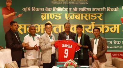नेपाली राष्ट्रिय फुटबल टोलीकी कप्तान सावित्रा भण्डारी ‘साम्बा’ र कृषि विकास बैंक लिमिटेडबीच ब्राण्ड एम्बेसडरको लागि सम्झौता नविकरण भएको छ