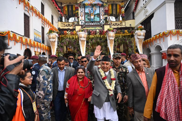 काठमाडौँ । राष्ट्रपति रामचन्द्र पौडेलले प्रथम महिला सबिता पौडेलसहित महाशिवरात्रिको अवसरमा पशुपतिनाथको दर्शन एवं पूजाआराधना गर्नुभएको छ । महाशिवरात्रि २०८१ का अवसरमा राष्ट्रपति पौडेलले बुधबार अपरान्ह पशुपतिनाथको दर्शनसहित पूजाआराधना गर्नुभएको हो । उहाँलाई पशुपतिनाथ मन्दिरका मूल भट्टले चन्दन र फूलप्रसाद प्रदान गर्नुभएको थियो । मन्दिर परिसरमा राष्ट्रपति पौडेललाई पशुपति क्षेत्र