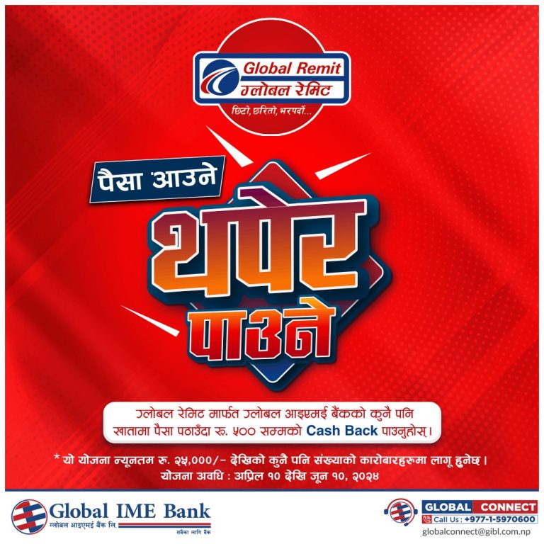 काठमाडौं । ग्लोबल आइएमई बैंक लिमिटेडले बैंकिङ्ग प्रणालीमाफर्त हुने रेमिट्यान्स कारोबारलाई प्रवद्र्धन गर्ने उद्देश्यले ग्लोबल रेमिटमार्फत पैसा पठाउँदा ५०० रुपैयाँसम्म क्यासब्याक पाइने नयाँ योजना सार्वजनिक गरेको छ । पैसा आउने, थपेर पाउने नारा सहित सार्वजनिक गरेको क्यासब्याक योजनामा ग्लोबल रेमिटमार्फत विदेशबाट ग्लोबल आइएमई बैंकमा रहेको खातामा पैसा पठाउँदा ५०० रुपैयाँसम्मको