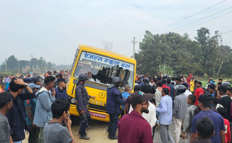 धनुषा । जनकपुरमा स्कुल बसको ठक्करबाट एक जनाको मृत्यु भएको छ । जनकपुरधाम उपमहानगरपालिका-२३ विन्धीमा एन्जल्स सेकेन्डरी बोर्डिङ स्कुलको बसले ठक्कर दिँदा स्थानीय ३५ वर्षीया राखीदेवी यादवको घटनास्थलमै मृत्यु भएको हो । दुर्घटनामा अन्य पाँच जना भन्दा बढी घाइते भएका छन् । उनीहरुलाई उपचारका लागि जनकपुरधाम लगिएको छ । दुर्घटनापछि स्थानीयले