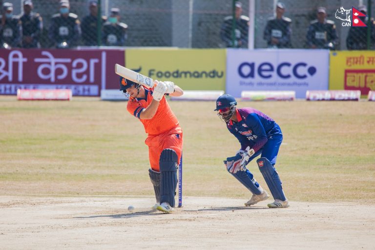 काठमाडौँ । त्रिकोणात्मक टी-२० सिरिजको दोस्रो खेलमा नेदरल्यान्ड्सविरुद्ध नेपालले तेस्रो सफलता हात पारेको छ । १३ औँ ओभरको अन्तिम बलमा