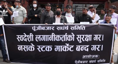 काठमाडौँ । पुँजी बजारमा स्वदेशी लगानीकर्ताको सुरक्षाको माग गर्दै सेयरधनीहरुले सरकारबिरुद्ध प्रदर्शन गरेका छन् । पुँजी बजार संघर्ष समितिको आह्वानमा