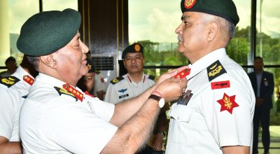 काठमाडौँ । नेपाली सेनाका प्रधानसेनापति अशोकराज सिग्देलले उपरथी दर्जामा बढुवा हुनुभएका रवीन्द्र खत्रीलाई दर्ज्यानी चिह्न प्रदान गर्नुभएको छ । सैनिक