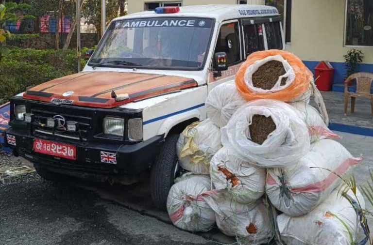 काठमाडौँ । प्रहरीले सुनसरीबाट गाँजा बोकेको एम्बुलेन्स नियन्त्रणमा लिएको छ । वराहक्षेत्र नगरपालिका–१ स्थित चतराबाट को.१च २९३७ नम्बरको एम्बुलेन्सबाट २७३ किलो गाँजा बरामत गरिएको सशस्त्र प्रहरी बलका सह–प्रवक्ता शैलेन्द्र थापाले जानकारी दिए । चतराबाट सूर्यकुण्ड जाने सडकमा रोकेर राखेको एम्बुलेन्स जाँच गर्दा ९ वटा पोकामा गाँजा भेटिएको डीएसपी थापाले बताए