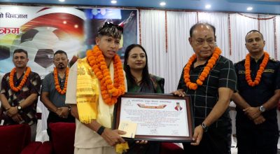 काठमाडौँ । नेपाली महिला राष्ट्रिय फुटबल टोलीकी कप्तान सावित्रा भण्डारीलाई हेटौंडामा सम्मान गरिएको छ । सञ्चारिका समूह मकवानपुरले शनिवार हेटौंडामा