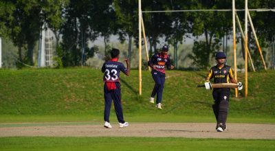 काठमाडौं । एसीसी यू–१९ प्रिमियर कपको उपाधिका लागि नेपालले आयोजक युएईसँग प्रतिस्पर्धा गरिरहेको छ । यसैबीच प्रेतियोगिताको उपाधि जित्न नेपालले १४८ रनको लक्ष्य पाएको छ । युएईमा जारी नेपालविरुद्ध घरेलु टोली ४५ ओभर ५ बलमा १४७ रनमा अलआउट भयो । युएईलाई सस्तैमा समेट्न नेपालका दयानन्द मण्डलले सर्वाधिक ६ विकेट लिए