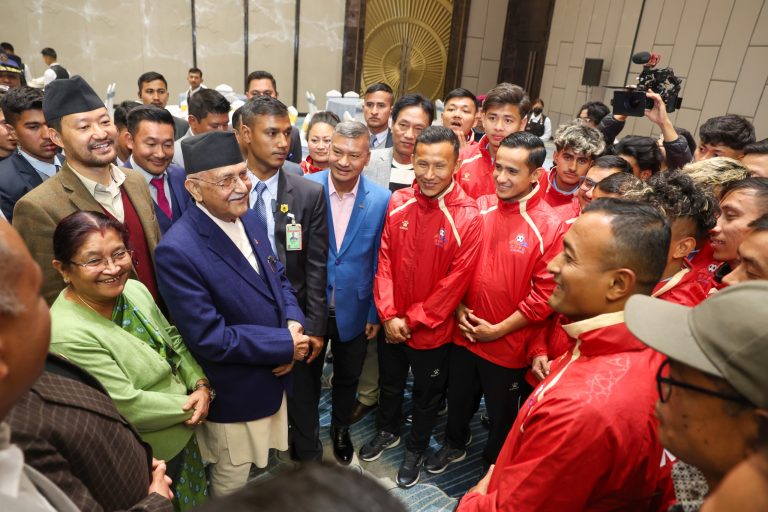 काठमाडौँ: प्रधानमन्त्री केपी शर्मा ओली र तेस्रो केपी ओली कप फुटबल च्याम्पियनसिपका खेलाडी तथा आयोजकबीच आज भेटघाट भएको छ । भेटका अवसरमा सो कपका अफिसियल उद्घोषक एवं एन्फाका प्रकाश रुचालका क्यान्सरपीडित आमाको उपचारका लागि केपी ओली क्लबका तर्फबाट रु एक लाख र प्रथम महिला राधिका शाक्यका तर्फबाट रु एक लाख