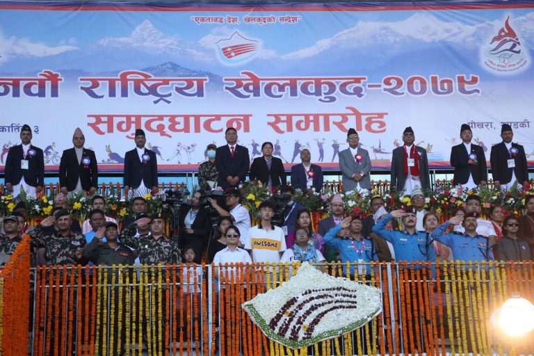 गण्डकी । पर्यटकीय नगरी पोखरामा नवौँ राष्ट्रिय खेलकुदको समुद्घाटन भएको छ । ‘एकताबद्ध देश खेलकुदको सन्देश’ भन्ने नाराका साथ सुरु नवौँ राष्ट्रिय खेलकुदको भव्य समारोहका बीच उपराष्ट्रपति नन्दबहादुर पुनले साँझ ८ः०० बजे पोखरा रङ्गशालामा उद्घाटन गर्नुभयो । उपराष्ट्रपति नन्दबहादुर पुनले पर्यटकीय नगरी पोखरामा भएको नवौँ राष्ट्रिय खेलकुद खेलाडीहरूको महान उत्सव