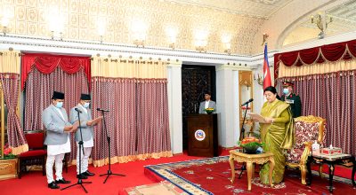 काठमाडौँ । राष्ट्रपति विद्यादेवी भण्डारीले दुई राजदूतलाई पद तथा गोपनीयताको शपथ गराउनुभएको छ । उहाँले आज राष्ट्रपतिको कार्यालयमा आयोजित एक