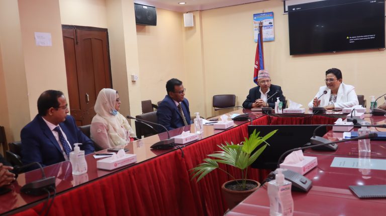 काठमाडौँ । ऊर्जा, जलस्रोत तथा सिँचाइमन्त्री पम्फा भुसालसँग नेपाल भ्रमणमा रहेको बङ्गलादेशको प्रतिनिधिमण्डलले भेटवार्ता गरेको छ । बुधबारदेखि काठमाडौँमा हुने नेपाल–बङ्गलादेशको संयुक्त निर्देशक समितिको बैठकका लागि नेपाल भ्रमणमा रहेको प्रतिनिधिमण्डलले आज मन्त्री भुसालसँग मन्त्रालयमा भेटवार्ता गरेको हो । भेटमा मन्त्री भुसालले दुई देशबीच हुने नियमित बैठकले अनुभव आदानप्रदान हुनुका साथै