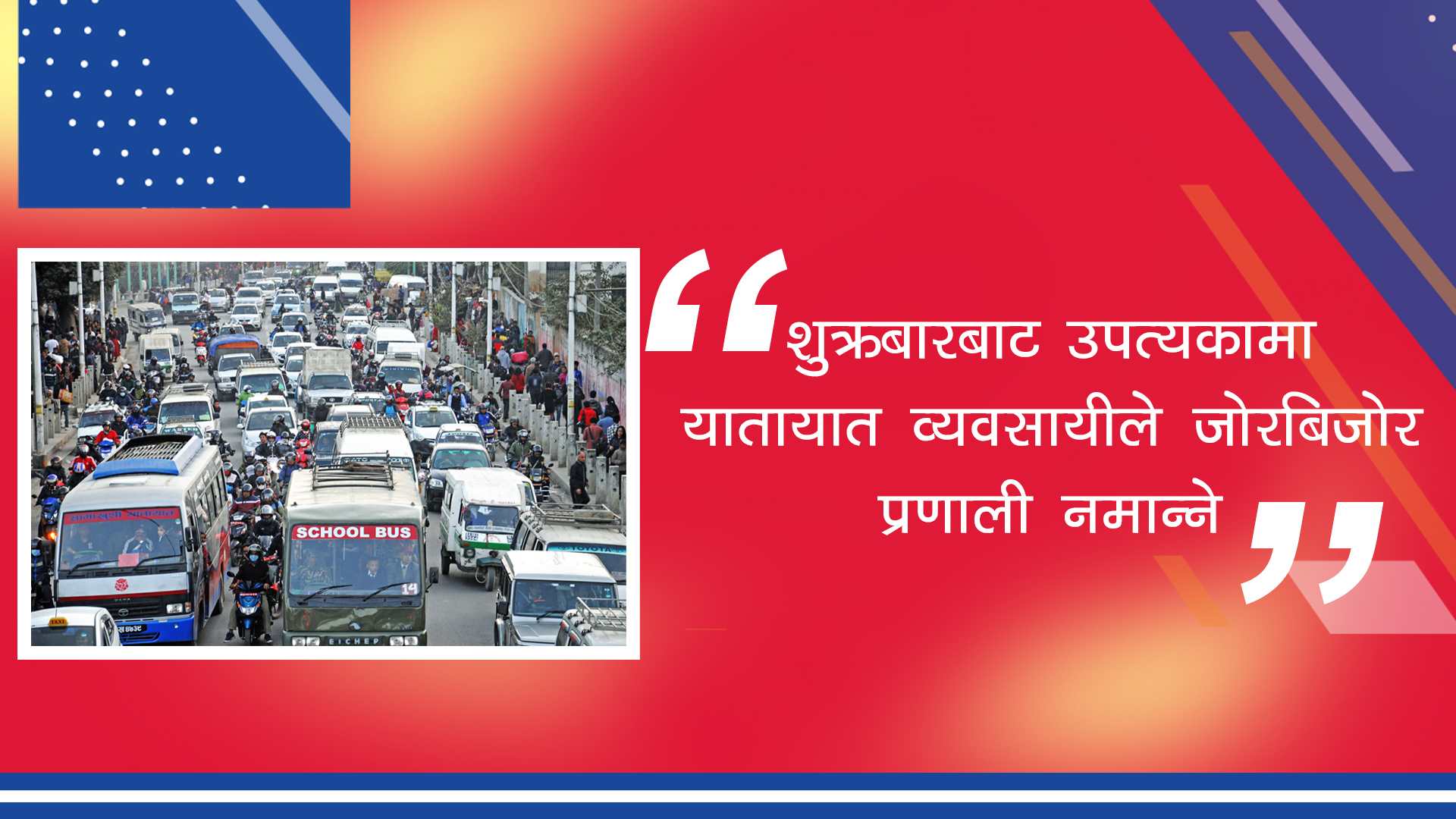 काठमाडौं । यातायात व्यवसायीले शुक्रबारबाट उपत्यकामा जोरबिजोर प्रणाली नमान्ने निर्णय गरेका छन् । उपत्यकामा मात्र आजोज १ बाट लागू भएको जोरबिजोर प्रणाली यात्रुको चाप बढ्दा पनि कायमै रहेको भन्दै व्यवसायी सबै सवारी सञ्चालन गर्ने निर्णयमा पुगेका हुन् । साधनमा यात्रुको चाप बढ्दो छ । तर जोरबिजोर प्रणालीले गर्दा सवारीको संख्या