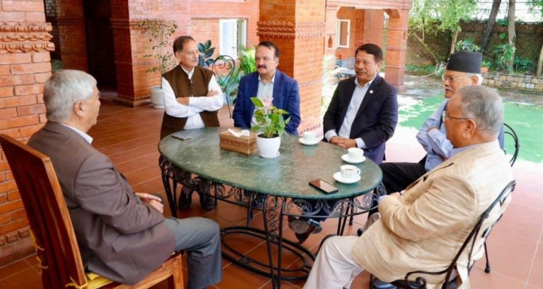 काठमाडौँ । नेपाली कांग्रेसका पाँच पदाधिकारी पार्टी सभापति शेरबहादुर देउवालाई भेट्न बुढानीलकण्ठ पुगेका छन् । नेताहरु कृष्णप्रसाद सिटौला, प्रकाशमान सिंह, विजय गच्छदार, गोपालमान श्रेष्ठ र डा। प्रकाशशरण महत आज बिहान साढे १० बजे देउवा निवास बूढानीलकण्ठमा पुगेका हुन् । सात जना पूर्व पदाधिकारीको सोमबार प्रकाशमान सिंह निवास चाक्सीबारीमा बैठक बसेको