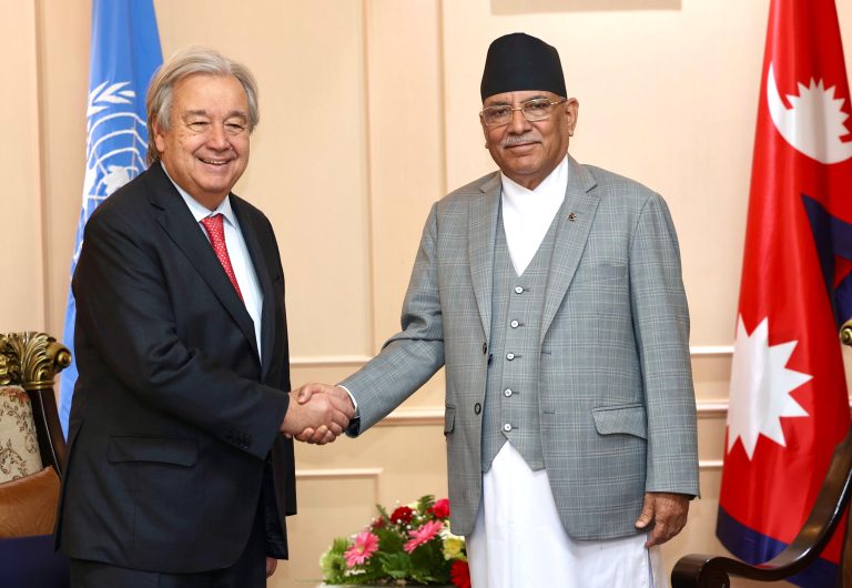 काठमाडौं । प्रधानमन्त्री पुष्पकमल दाहाल र नेपालको औपचारिक भ्रमणमा आउनुभएका संयुक्त राष्ट्रसंघका महासचिव एन्टोनियो गुटेरेसबीच भेटबार्ता भएको छ । प्रधानमन्त्री दाहालसंग गुटरेसले प्रधानमन्त्री कार्यलयमा भेट गर्नुभएको छ । प्रधानमन्त्री दाहालले महासचिव गुटेरेसको सम्मानमा आइतबार साँझ सांस्कृतिक कार्यक्रमसहितको रात्रिभोजको आयोजना गर्नुभएको छ । भ्रमणका क्रममा गुजरेस सोमबार नाम्चे, पोखरा, अन्नपूर्ण आधार
