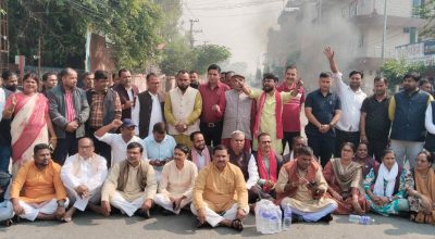 मधेश प्रदेशका मुख्यमन्त्री सरोजकुमार यादवको नियुक्ति असंवैधानिक रहेको भन्दै सात दलका सांसदहरू जनकपुरधामस्थित मधेश प्रदेश सभा भवन अगाडि धर्नामा बसेका