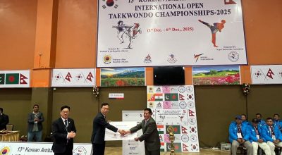 काठमाडौँ। तेह्रौँ कोरियन एम्बेसडर अन्तरराष्ट्रिय तेक्वान्दो प्रतियोगिता आजदेखि ललितपुरमा सुरु भएको छ । नेपालस्थित दक्षिण कोरियाली दूतावास र नेपाल तेक्वान्दो