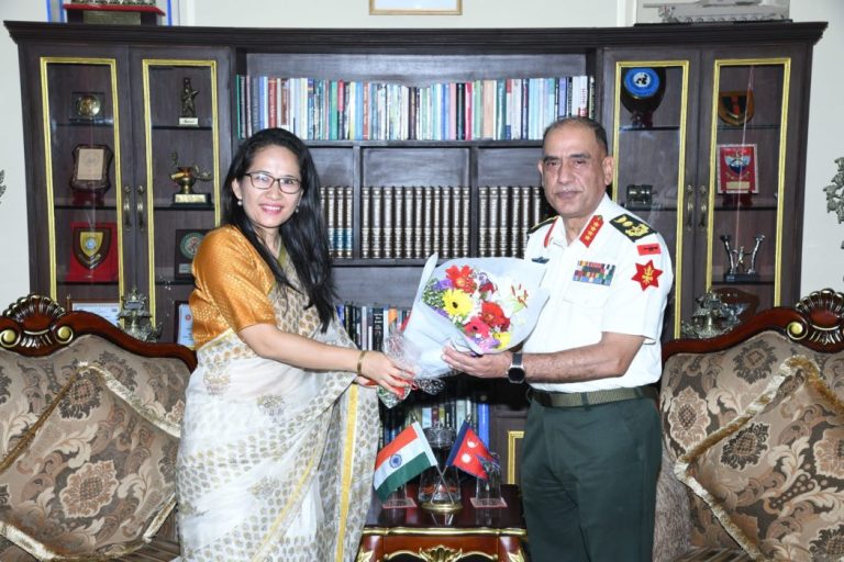 काठमाडौं । प्रधानसेनापति प्रभुराम शर्मा र नेपालका लागि भारतका कार्यवाहक राजदूत नाम्ग्या सी खम्पाबीच भेटवार्ता भएको छ । सेनाको मुख्यालय भद्रकालीमा भएको भेटमा दुई पक्षीय आपसी हित तथा पारस्परिक सम्बन्धका विषयमा छलफल भएको सेनाले जनाएको छ । सेनाले यस किसिमको भेटघाटले दुई देशबीच रही आएको आपसी सम्बन्धलाई थप सुमधुर एवं