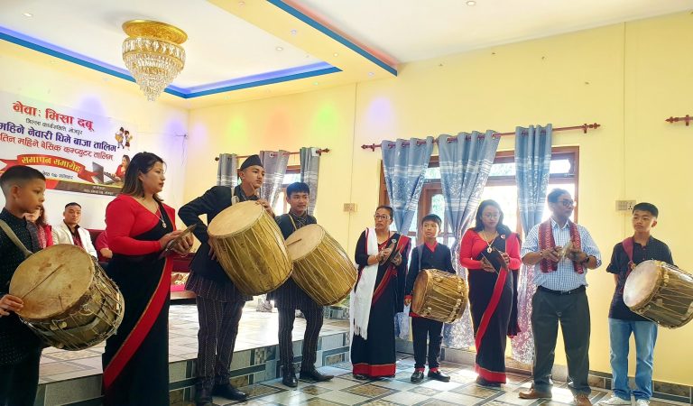 टक्सार, (भोजपुर) । भोजपुरको नेवार समुदाय आफ्नो भाषा र संस्कृतिको जगेर्नामा जुटेको छ । लोप हुन लागेको धिमे बाजाको परम्परालाई संरक्षण गर्न जिल्लामा एकमहिने धिमे बाजा प्रशिक्षण कार्यक्रम सञ्चालन गरिएको छ । नेवार समुदायमा प्रचलित धिमे बाजालाई जोगाइराख्न नेवा: मिसा दबुको आयोजनामा एकमहिने तालिमको आयोजना गरिएको संस्थाकी अध्यक्ष अवनी शाक्यले