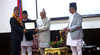 काठमाडौँ । राष्ट्रपति रामचन्द्र पौडेलले वरिष्ठ पत्रकार एवं सूचनाको हकका अभियन्ता तारानाथ दाहाललाई सम्मान गर्नुभएको छ । सूचनाको हकको कार्यान्वयन,