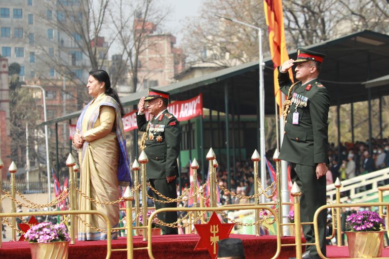 काठमाडौँ । राष्ट्रपति विद्यादेवी भण्डारी महाशिवरात्रि तथा २६०औँ सेना दिवसका अवसरमा नेपाली सेनाद्वारा सैनिक मञ्च टुँडिखेलमा आज आयोजित विशेष समारोहमा सरिक हुनुभयो । सो अवसरमा राष्ट्रपति भण्डारीबाट त्यहाँस्थित सैनिक स्मारकमा पुष्पहार अर्पण गरी श्रद्धाञ्जली व्यक्त गर्नुका साथै नेपाली सेनाद्वारा अर्पण गरिएको सलामी ग्रहण गर्नुभयो । राष्ट्रपति भण्डारी नेपाली सेनाका परमाधिपति