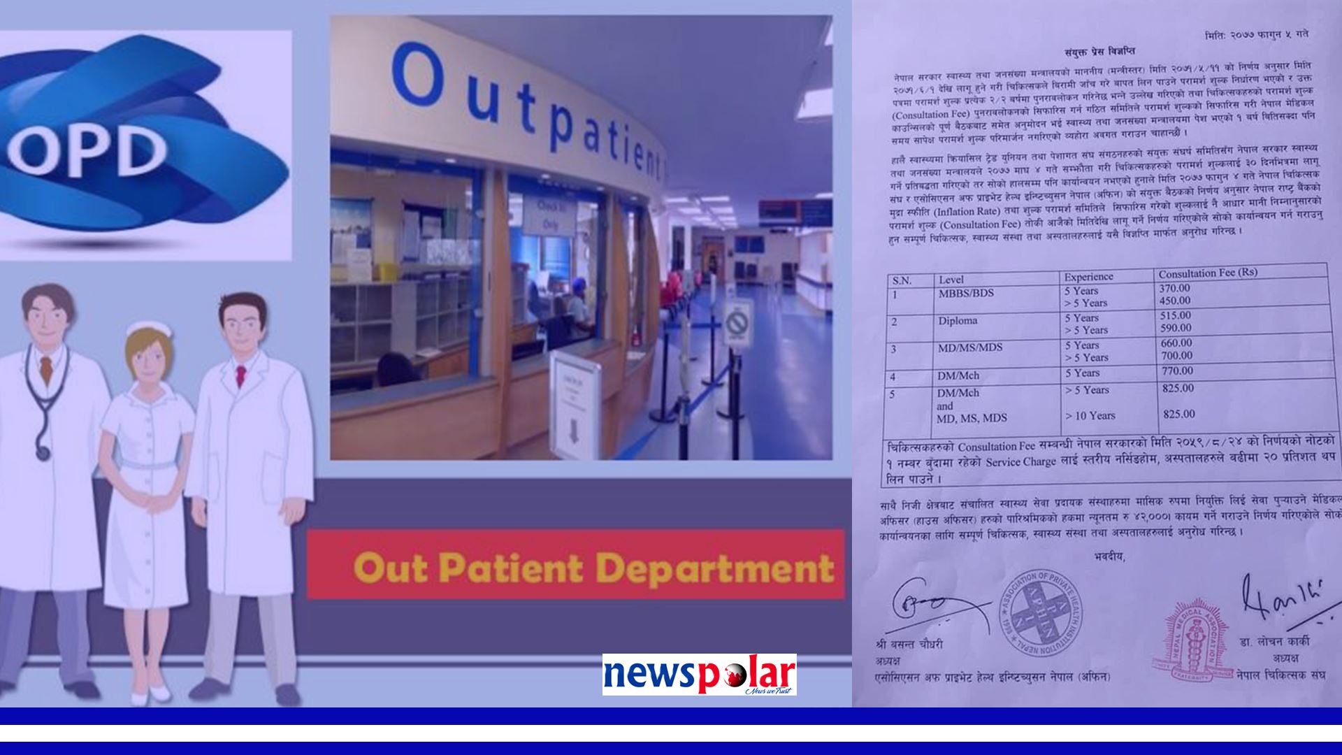 काठमाडौं । आजबार अस्पतालमा डाक्टरको ओपिडी (बिहिरंग) शुल्क बढेको छ। स्वास्थ्य मन्त्रालयसँगको सहमति अनुसार नेपाल चिकित्सक संघ र एसोसिएसन अफ प्राइभेट