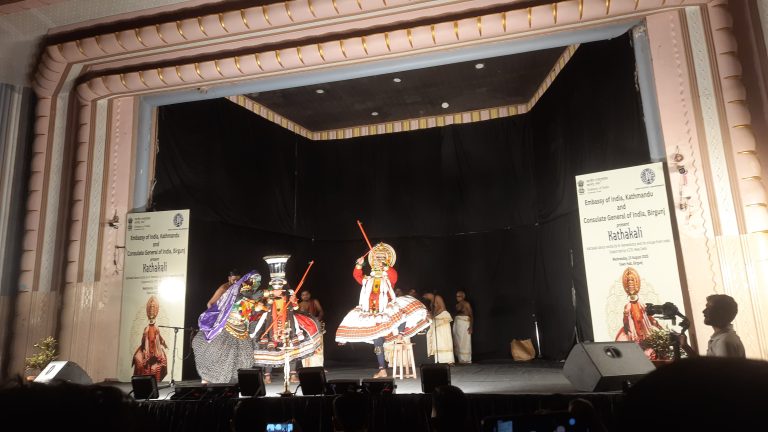 वीरगञ्ज, (पर्सा) । भारतको ७९औँ स्वतन्त्रता दिवसको पूर्वसन्ध्यामा वीरगञ्जमा बुधबार भारतीय कला संस्कृति झल्किने ‘कथाकली’ नृत्य प्रस्तुत गरिएको छ । काठमाडौँस्थित भारतीय दूतावास र भारतको महावाणिज्य दूतावास वीरगञ्जको आयोजनामा बुधबार बेलुका यहाँ नृत्य प्रस्तुत गरिएको छ । भारतको केरला राज्यमा निकै प्रख्यात मानिएको महाभारतको कथामा आधारित कथाकली नृत्यु केरलाबाट आएका