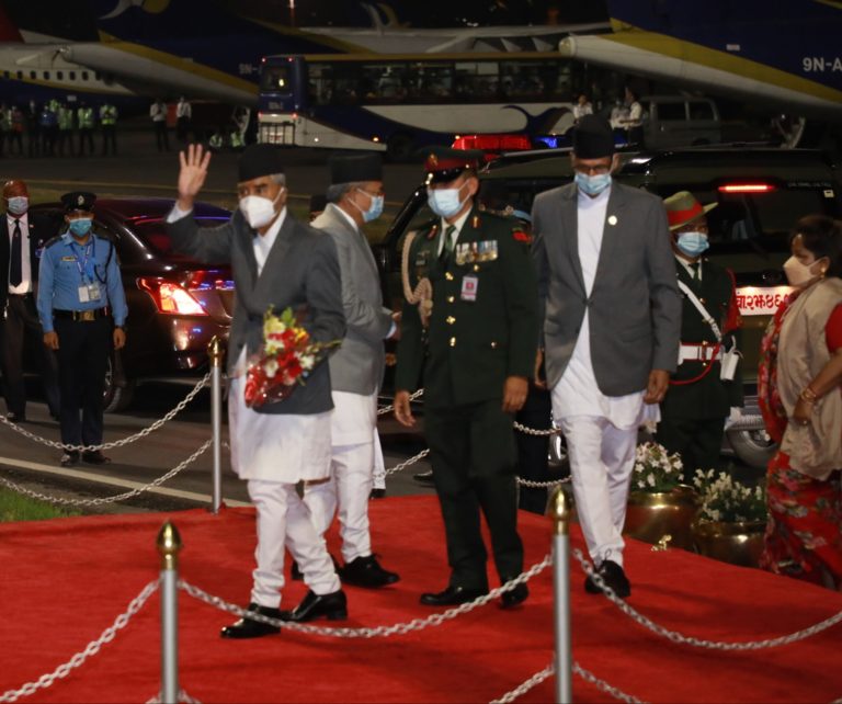 काठमाडौ । प्रधानमन्त्री शेरबहादुर देउवा भारतको तीन दिने औपचारिक भ्रमण पूरा गरी स्वदेश फर्कनु भएको छ । प्रधानमन्त्री देउवा नेपाल एयरलाईन्सको विमानबाट आईतबार साँझ स्वदेश फर्कनु भएको हो । उहाँलाई कार्यबहाक प्रधानमन्त्री बालकृष्ण खाँण, सभामुख अग्नीप्रसाद सापकोटासहित नेपाल सरकार उच्च पदस्थ कर्मचारीहरुले विमानस्थलमा स्वागत गरेका थिए । त्यस अवसर नेपाली सेनाले