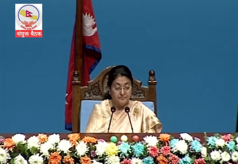 काठमाडौँ । राष्ट्रपति विद्यादेवी भण्डारीले सङ्घीय संसद्को संयुक्त बैठकलाई सम्बोधन गर्दै हुनुहुन्छ । राष्ट्रपतिले गर्नुभएको सम्बोधनको प्रति प्रधानमन्त्री पुष्पकमल दाहाल ‘प्रचण्ड’ले आजै बस्ने प्रतिनिधिसभा र राष्ट्रियसभामा छुट्टाछुट्टै टेबल गर्नुहुनेछ । त्यसपछि दुवै सदनले धन्यवादको प्रस्ताव पारित गर्नेछन् । नेपालको संविधानको धारा ९५ मा राष्ट्रपतिले सङ्घीय संसद्को कुनै सदनको बैठक वा