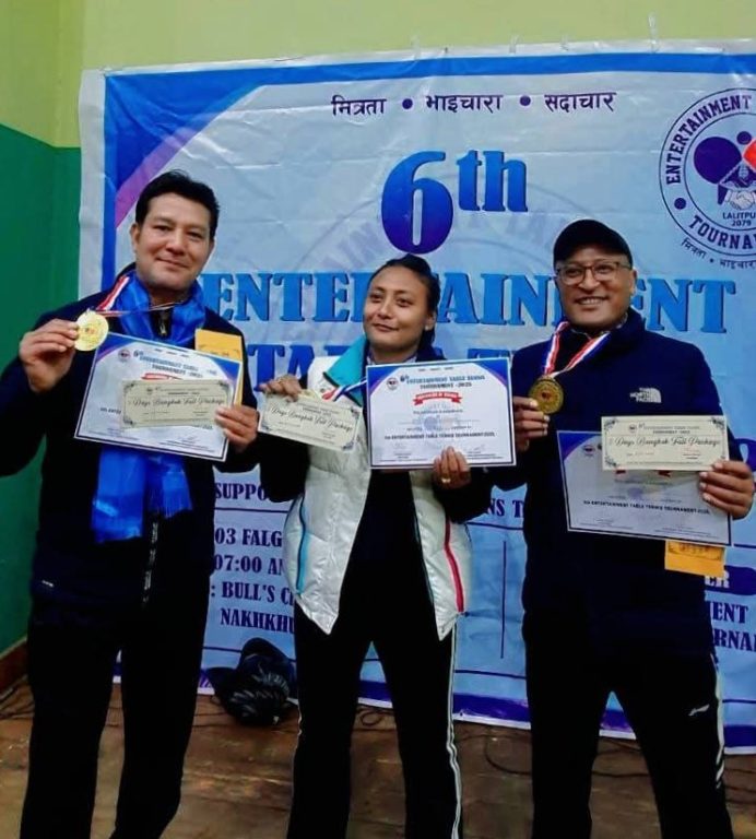 काठमाडौं। राजेन्द्र वज्राचार्य, मुकेश महर्जन र अनिता महर्जनले छैटौं इन्टरटेन्मेन्ट टेबलटेनिस प्रतियोगिताको उपाधि जितेका छन् । टिम इभेन्टको स्पर्धामा मात्र प्रतिस्पर्धा भएको प्रतियोगिताको फाइनलमा राजेन्द्र, मुकेश र अनिताको टोलीले रविन्द्र शाक्य, हरिप्रसाद खरेल र राम महर्जन सम्मिलित टोलीलाई २–१ ले पराजित गरे । इन्टरटेन्मेन्ट टेबलटेनिस टुर्नामेन्ट, ललितपुरद्वारा आयोजित प्रतियोगितामा किरण
