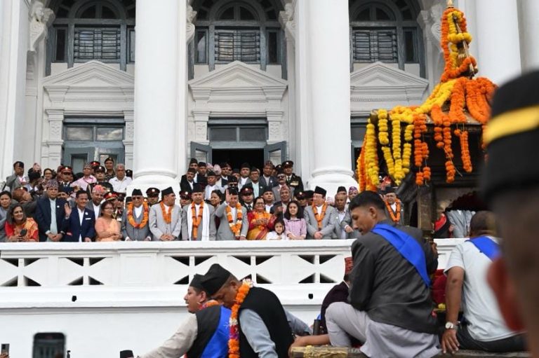 काठमाडौं । राष्ट्रपति रामचन्द्र पौडेलले प्रथम महिला सबिता पाैडेलसहित शनिबार ईन्द्रजात्रा अवलोकन गर्नुभएको छ । सांस्कृतिक एवं ऐतिहासिक पर्व इन्द्रजात्राका अवसरमा राष्ट्रपति पौडेल जुद्ध सालिकदेखि पैदल हनुमाढोका दरबार क्षेत्रस्थित गद्दी बैठक गई जात्रा अवलोकन गर्नुभएको हो । साे अवसरमा उहाँलाई काठमाडौं महानगरपालिकाका प्रमुख बालेन साहले स्वागत गर्नुभएको थियो । जात्राका