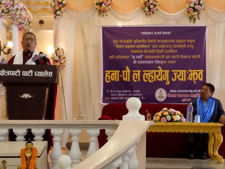 काठमाडौँ। उपप्रधान तथा शहरी विकासमन्त्री प्रकाशमान सिंहले बुद्धजन्मभूमि लुम्बिनीमा नेपाली वास्तुकलाको अनुपम नमूना ‘लुम्बिनी बज्रयान महाविहार’ निर्माणका लागि अमूल्य कलाकृति तथा वस्तु दान प्रदान गर्नुहुने दाता महानुभावहरूलाई आज यहाँ सम्मानपत्र प्रदान गर्नुभयो । विसं २०६८ तिर निर्माण प्रारम्भ गरिएको यस महाविहारको निर्माण स्वदेशभित्रबाटै स्रोत जुटाएर सम्पन्न गरिएको हो । यस