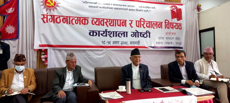 काठमाडौं । ‘श्रावण महिनाभर नेकपा एमालेले संगठन सुदृढीकरण र शुद्धिकरण (सुसु) अभियान संचालन गर्ने’ निर्णय गर्दै नेकपा एमाले बाग्मती प्रदेश कमिटी द्वारा आयोजित ‘संगठनात्मक व्यवस्थापन र परिचालन’ विषयक दुई दिने कार्यशाला गोष्ठी हिजो असार १८ गते शुरु भएर आज १९ गते काठमाडौमा सम्पन्न भएको छ । नेकपा एमालेका अध्यक्ष केपी