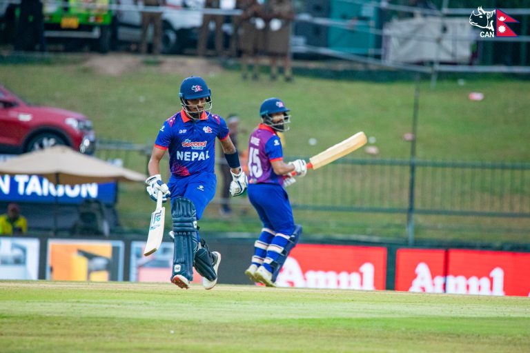 सोमपाल कामी २७ रनमा खेल्दैछन् भने उनलाई सन्दीपले ४ रन बनाएर साथ दिइरहेका छन् ।
