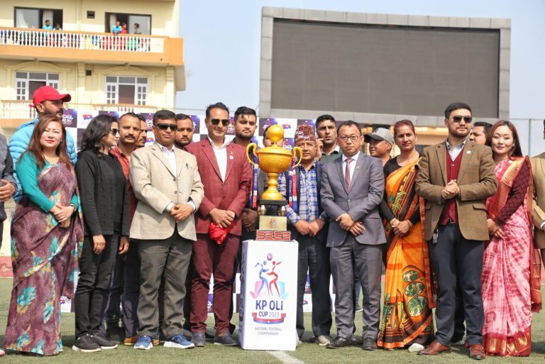 काठमाडौँ । केपी ओली कप राष्ट्रिय फुटबल च्याम्पियनसिपको उपाधि ट्रफी सार्वजनिक गरिएको छ । आयोजक राष्ट्रिय युवा संघ नेपालले मंगलबार