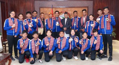 काठमाडौँ । प्रधानमन्त्री केपी शर्मा ओलीले ‘दक्षिण एसियाली युुथ टेबल टेनिस प्रतियोगिता’मा पदक विजेता खेलाडीलाई बधाई ज्ञापन गर्नुुुभएको छ ।