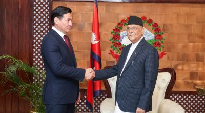 काठमाडौँ । प्रधानमन्त्री केपी शर्मा ओलीसँग रुसी महासङ्घअन्तर्गतको काल्मिकियाका प्रमुख बाटु कासिकोभ नेतृत्वको प्रतिनिधिमण्डलले आज शिष्टाचार भेट गरेको छ ।