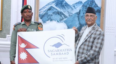 काठमाडौँ । प्रधानमन्त्री केपी शर्मा ओलीले सगरमाथा संवाद कार्यक्रमको प्रवर्द्धनका लागि विश्वको सर्वोच्च शिखर सगरमाथा चढ्ने तयारीमा रहेका सशस्त्र प्रहरीका