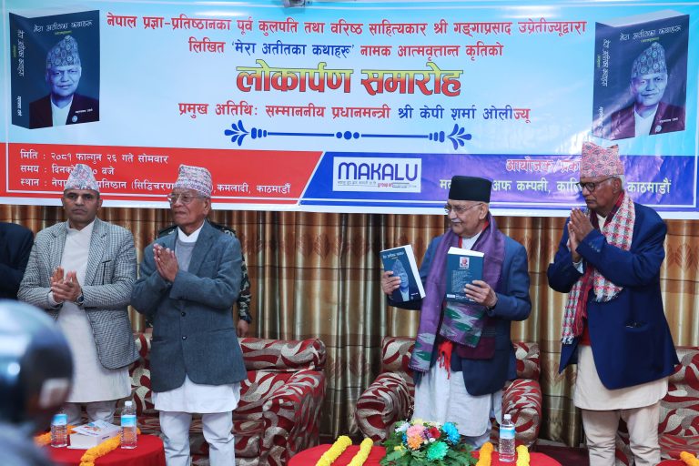 काठमाडौँ, २६ फागुन । प्रधानमन्त्री केपी शर्मा ओलीले नेपाल प्रज्ञा प्रतिष्ठानका पूर्व कुलपति गङ्गाप्रसाद उप्रेतीको आत्मवृतान्त ‘मेरा अतीतका कथाहरु’ को आज आयोजित कार्यक्रमबीच लोकार्पण गर्नुभएको छ । मकालु प्रकाशनद्वारा प्रकाशित सो पुस्तक लोकार्पण गर्दै प्रधानमन्त्री ओलीले उप्रेती जस्तोसुकै परिस्थितिमा पनि देश र परिवर्तनप्रति खुलस्तरुपमा निष्ठापूर्णरुपमा लागेका व्यक्ति भएकाले उहाँका
