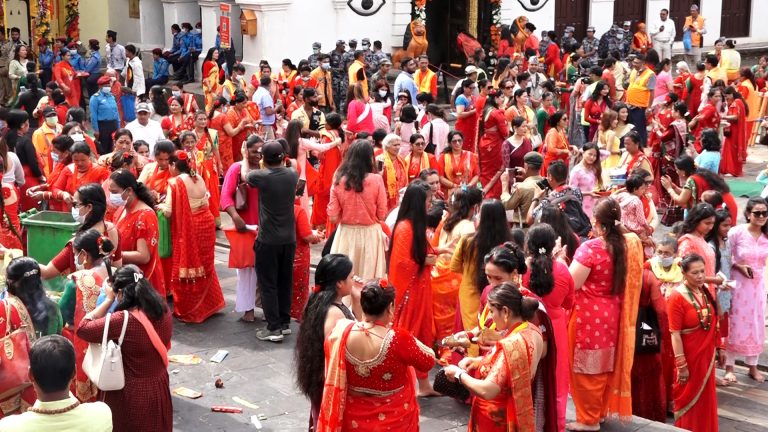 काठमाडौँ । हरितालिका (तीज) पर्वमा पशुपतिनाथको दर्शन गर्न आउने भक्तजनका लागि मूल मन्दिरका चार ढोका बिहान ३:०० बजेदेखि खोलिएको पशुपति क्षेत्र विकास कोषले जनाएको छ । तीजका अवसरमा भगवान् श्रीपशुपतिनाथको दर्शनार्थी पाल्नुहुने भक्तजन एवं विशेषगरी हिन्दू नारीहरुलाई सहज रुपमा दर्शन गर्न पाउने व्यवस्थाका लागि पशुपतिनाथका चार ढोका बिहान ३:०० बजेदेखि